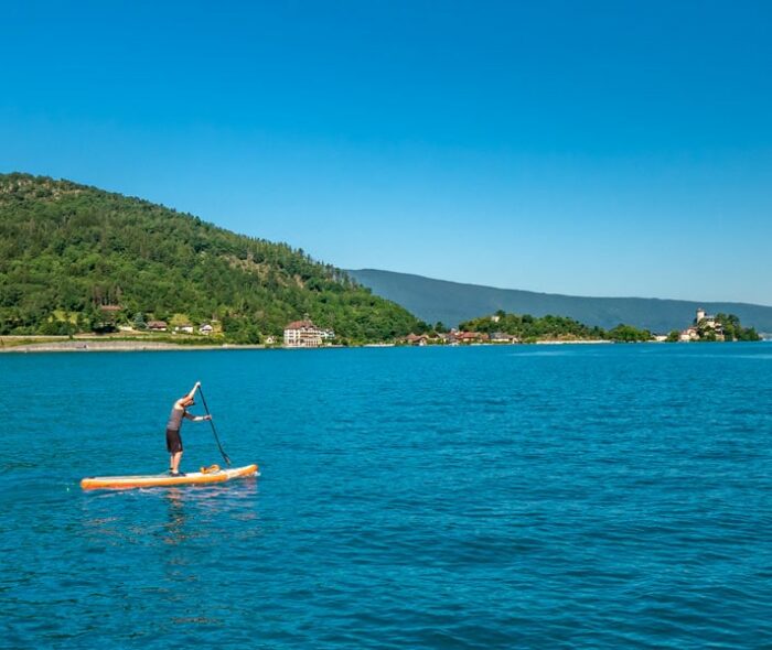 Stand Up Paddle (SUP) ist eine Aktivität, die darin besteht, aufrecht mit einem Paddel auf einem großen, breiten Brett zu paddeln. Alleine, paarweise oder sogar in Gruppen, die Kombinationen sind zahlreich. Verleih, Kurse, Verbesserung, betreute Ausflüge, Yoga-Paddel… Der Annecy-See ist zu einem unverzichtbaren Ort für diese Disziplin geworden! Ob im Wettkampf oder in der Entspannung, Sie werden den See und seine Ecken aus einem anderen Blickwinkel (und in allen Jahreszeiten) entdecken…